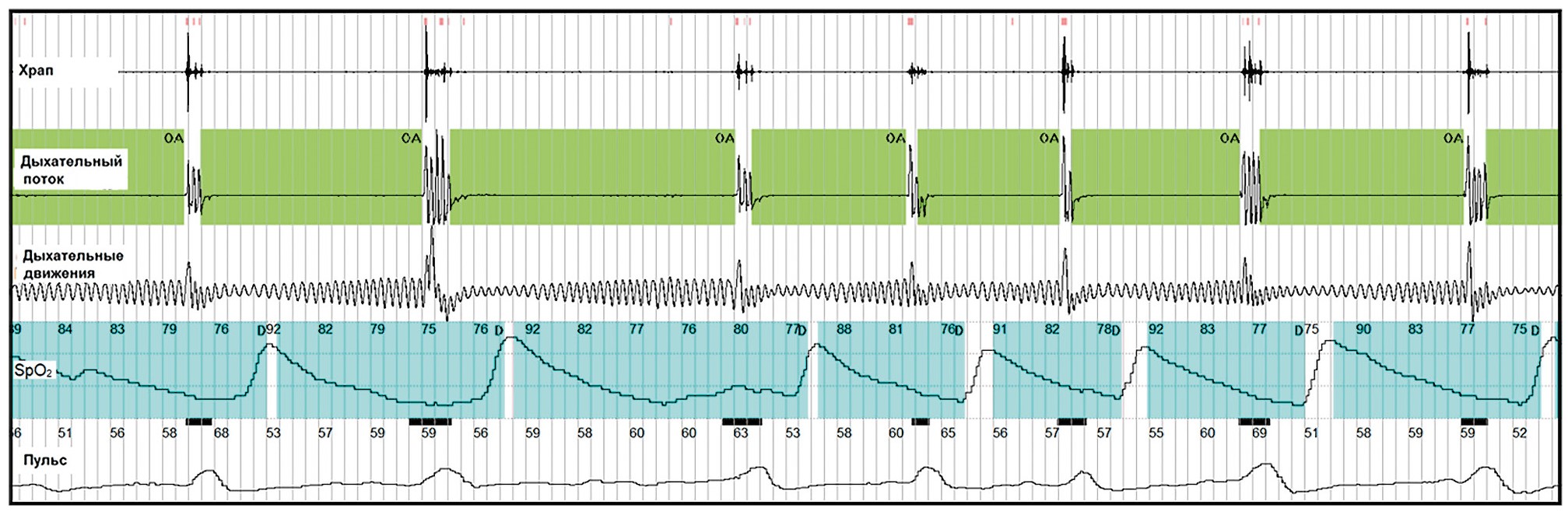 Рис. 2. Кардиореспираторное мониторирование во время сна (фрагмент записи). Исчезновение респираторного потока происходит на фоне сохраняющихся дыхательных усилий и сопровождается характерными изменениями ЧСС и сатурации O2. При восстановлении дыхания возникает интенсивный храп.