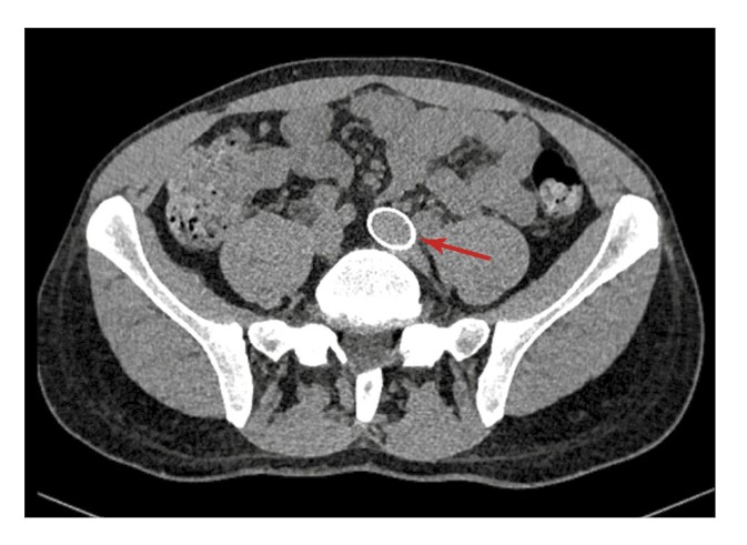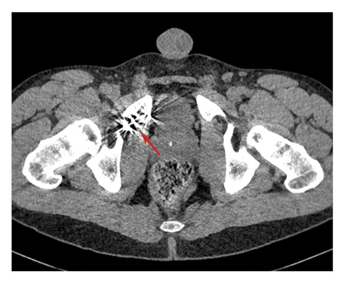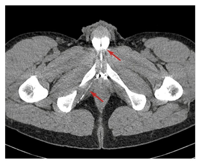 Рис. 2. Данные МСТК-кавернозографии больного К. Стрелкой указаны гиперденсивные инородные структуры (вероятно, спирали) в области правой лобковой кости.