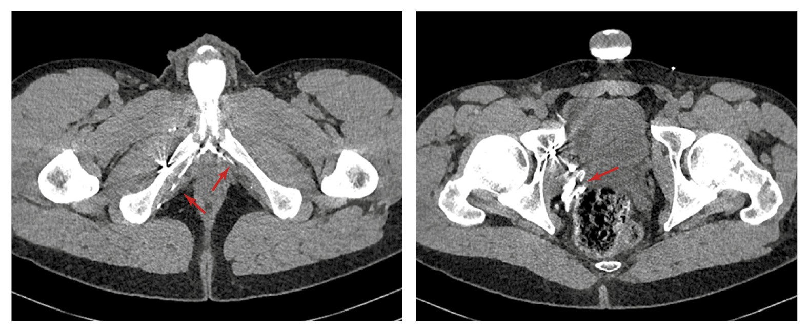С целью подтверждения венозной утечки и оценки венозной анатомии половой системы пациенту проведена МСКТ-кавернозография. Фармакологическую стимуляцию осуществляли посредством введения 10 мкг простагландина интракавернозно. Получены изображения в нативную фазу (до введения контрастного вещества), а также через 30 с, 1, 3 и 5 мин после интракавернозного введения контрастного препарата (йогексола 350 мг/мл, 50 мл). По данным КТ в области наружной и внутренней поверхностей правой лобковой кости определяются множественные гиперденсивные структуры, вероятно, эмболизационные спирали (рис. 2).
