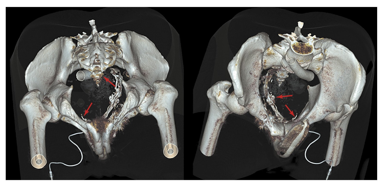Рис. 6. 3D-реконструкция КТ-кавернозографии. Стрелками указаны значительный сброс контрастированной крови из кавернозных тел через венозный коллектор простатического сплетения в правую общую подвздошную вену (3–5-я минута после введения контрастного препарата).
