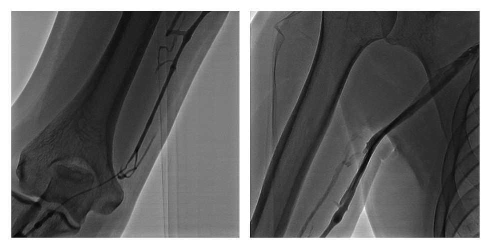 Пациенту предложено проведение повторной эмболизации вен перипростатического сплетения, но с применением внутрисосудистого неадгезивного эмболизирующего клея «КАП». С учетом данных анамнеза и КТ принято решение о ретроградном доступе к перипростатическому венозному сплетению. Под ультразвуковым контролем пунктирована локтевая вена на правой руке с последующей установкой в ней инъекционного катетера многократного использования размером 18G. Для уточнения анатомии венозной системы правой руки и выбора оптимального инструментария выполнена флебография (рис. 7), которая демонстрирует доступ к медиальной подкожной вене руки (vena basilica).