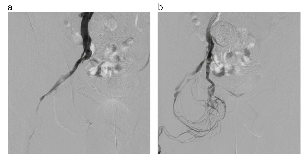 Рис. 8. Флебограмма: а – правой общей подвздошной вены; b – части путей оттока из папапростатического сплетения.