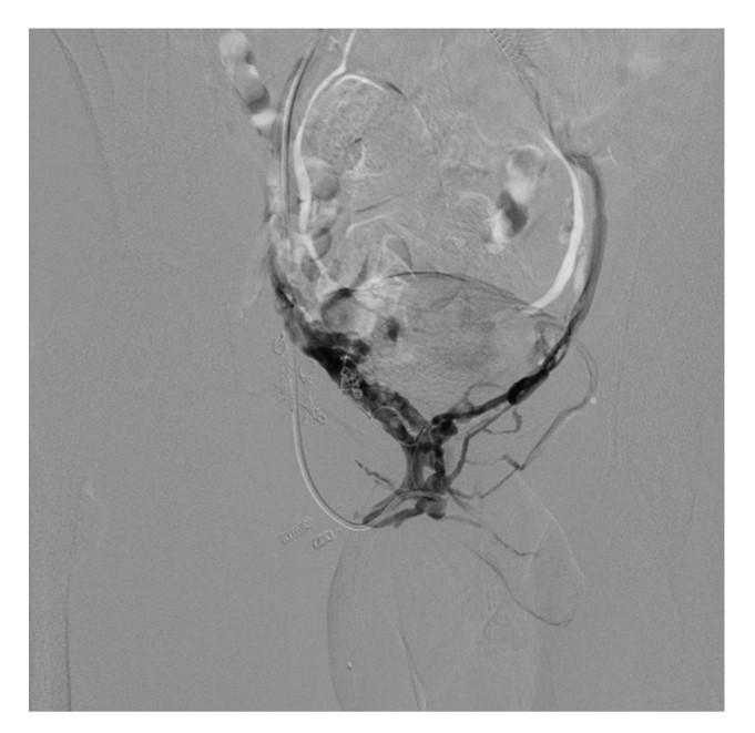 Инъекционный катетер в v. basilica по проводнику заменен на интродьюсер 5 Fr. На гидрофильном проводнике 260 см катетер perfoma hockey stick проведен в правую внутреннюю подвздошную вену, выполнена флебография в режиме цифровой субтракционной ангиографии (digital subtraction angiography – DSA), выявлен патологический дренаж контрастированной крови из системы дорсальных вен ПЧ (рис. 8).