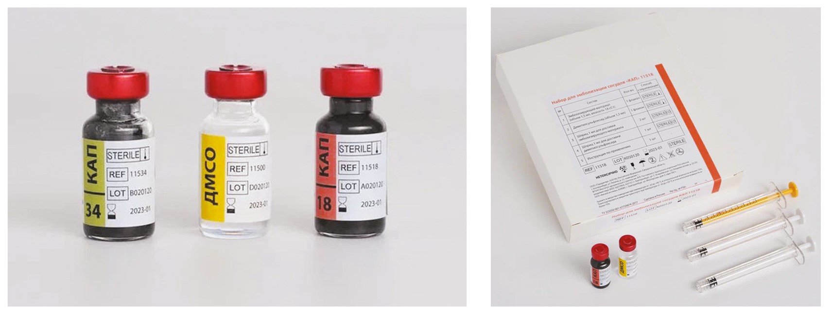 Для финальной эмболизации принято решение об использовании жидкого неадгезивного эмболизата на основе сополимера этилена и винилового спирта «КАП», который предназначен для внутрисосудистой окклюзирующей эмболизации целевого пространства. Данный эмболизат в Российской Федерации производит ООО «Парадигма» (г. Екатеринбург), который зарегистрирован в Росздравнадзоре (РЗН) и имеет регистрационный номер РЗН №2023/19889. «КАП» выпускается в 2 вариантах объема – 1,5 и 6 мл, а также в 2 вариантах вязкости – 18 и 34 сСт (сантистокс) для низкопотоковых (венозных) и высокопотоковых (артериальных) эмболизаций соответственно. В суспензионный раствор сополимера этилена и винилового спирта добавляется мелкодисперсный порошок тантала в качестве рентгенконтрастного вещества, что обеспечивает флюороскопически контролируемую эмболизацию. Растворителем для эмболизата служит диметилсульфоксид (ДМСО) – нетоксичное распространенное в фармации вещество, которое безопасно растворяется в крови и интерстициальных жидкостях. При контакте с водой или кровью компоненты «КАП» выпадают в осадок, формируя губчатый связанный эмбол. Важным свойством неадгезивного эмболизата является способность затвердевать по направлению от наружного слоя к внутреннему, что позволяет ему продвигаться в сосуде более дистально. Поскольку «КАП» не адгезивен, смещение микрокатетера не требуется ни для продолжительного его введения, ни для постэмболизационной ангиографии. В набор для эмболизации входит все необходимое: стерильные флаконы с «КАП» и ДМСО, шприцы для введения указанных компонентов, инструкция по применению (рис. 10).