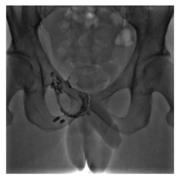 Рис. 11. Рентгенограмма тазовой области сразу после завершения процедуры эмболизации.