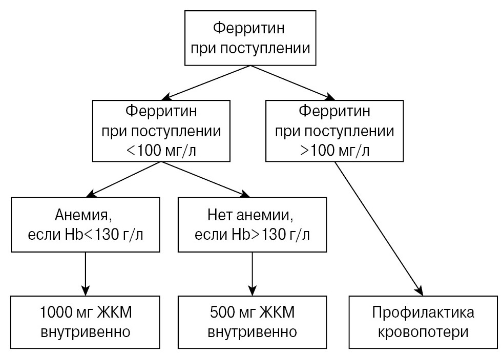 Ретроспективное одноцентровое исследование выполнено на базе отделения кардиохирургии ГБУЗ СО «НПЦ СВМП “Уральский институт кардиологии”» г. Екатеринбурга. В исследование включены данные историй болезни 113 пациентов, оперированных на открытом сердце за 2022–2024 гг. Все пациенты разделены на две группы. В группу 1 включены 60 пациентов с анемией в предоперационном периоде. Анемия идентифицирована при уровне Hb<130г/л вне зависимости от пола. В группу 2 включены 53 пациента без анемии. ДЖ идентифицирован в случае выявления ферритина <100 мкг/л. Протокол назначения ЖКМ представлен на рис. 1. Инфузию ЖКМ осуществляли за 1–3 дня до операции.