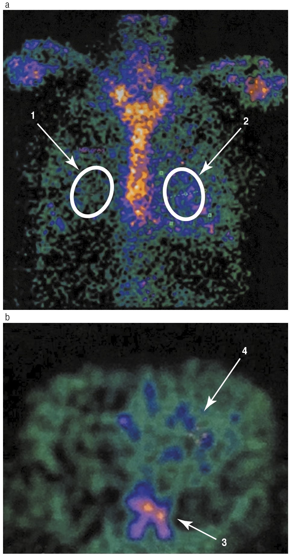 a – планарное исследование – статическая сцинтиграфия в передней прямой проекции. Сравнение накопления РФП в области сердца (2) с контрлатеральной областью ребер (1). При вычислении соотношения – GRADE 1 – видимое накопление, но его интенсивность ниже, чем в костных структурах; b – гибридное исследование – ОФЭКТ: стенка и полость ЛЖ в области сердца (4) четко не дифференцируются, накопление РФП преимущественно в пуле крови (показано синим цветом), не превышает накопление в ребрах. Цифрой 3 отмечен позвоночник.