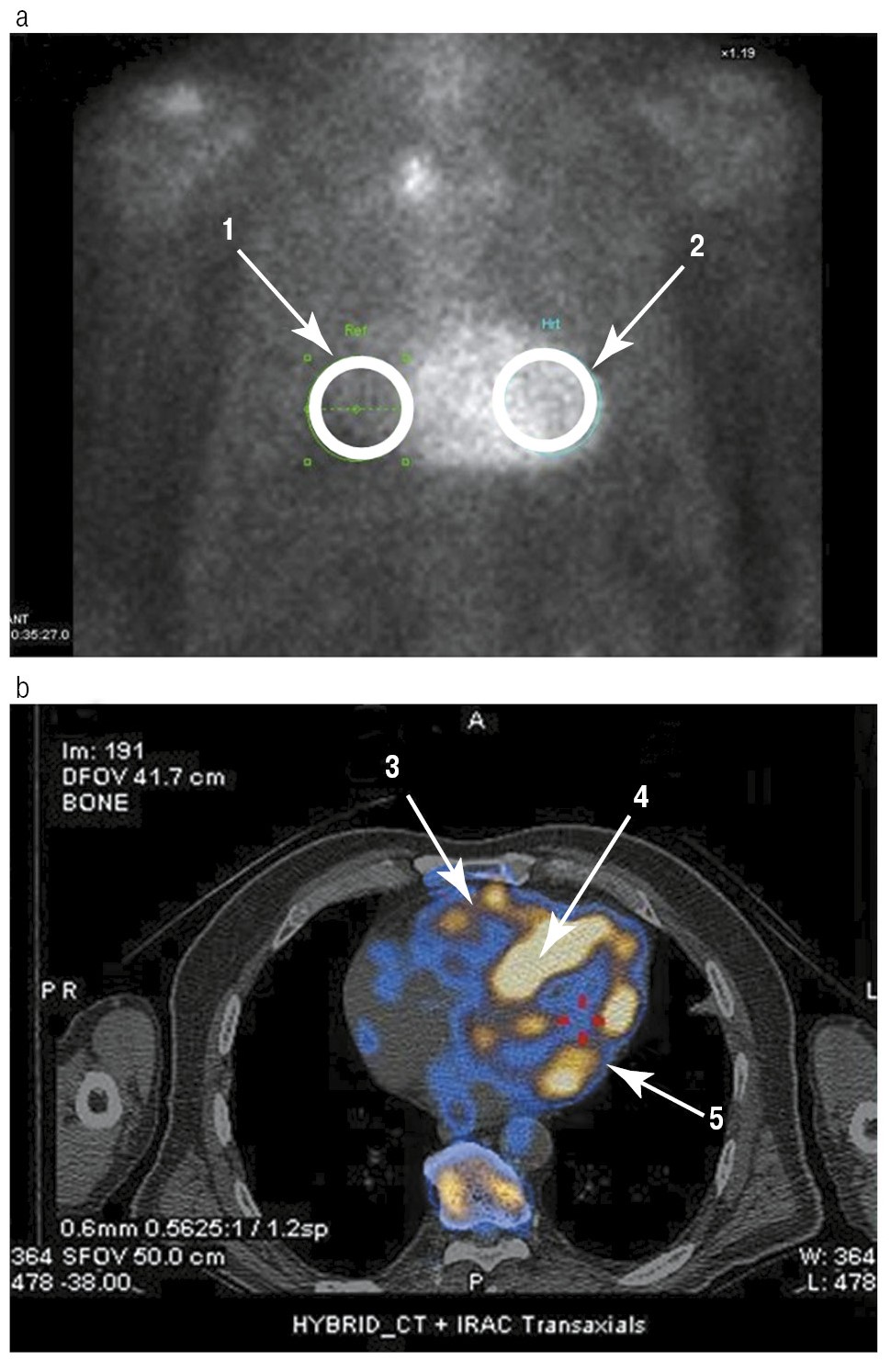 a – планарное исследование – статическая сцинтиграфия в передней прямой проекции. Сравнение накопления РФП в области сердца (2) с контрлатеральной областью ребер (1). При вычислении соотношения – Grade 3 – видимое накопление, но его интенсивность выше, чем в костных структурах; b – гибридное исследование – ОФЭКТ: четко дифференцируются стенка ПЖ (3), ЛЖ (5) и межжелудочковая перегородка (4) [показано желтым цветом], накопление РФП в которых превышает накопление в ребрах.