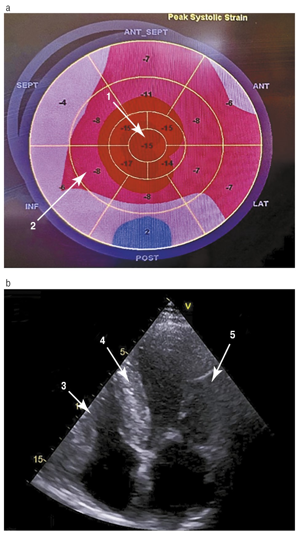 a – глобальная продольная деформация ЛЖ («бычий глаз», «вишенка на торте»), в англоязычной литературе – global longitudinal strain. Стрелка «1» указывает на верхушку ЛЖ, в которой параметры деформации (по-простому говоря, сократимости) сохранены (отмечено красным). Стрелка «2» указывает на базальные и средние сегменты, в которых данный параметр снижен (феномен apical sparing); b – 4-камерная позиция при ЭхоКГ. Стрелки «3» и «5» указывают на стенки ПЖ и ЛЖ соответственно, «4» – межжелудочковая перегородка (обращает внимание наличие «зернистости»).