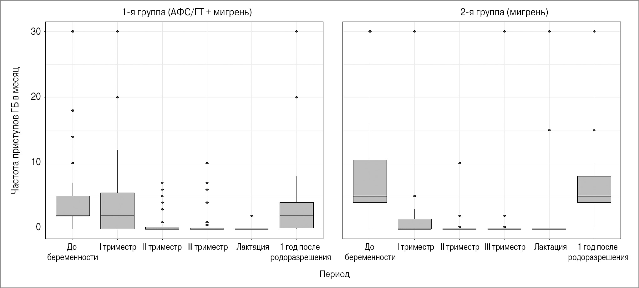 Результаты. Во 2-й группе наступление беременности сопровождалось снижением частоты ГБ вплоть до полного исчезновения у большинства пациенток во II и III триместрах, а также во время лактации. Через 1 год после родов частота ГБ была сопоставима с таковой до беременности. У пациенток 1-й группы частота ГБ в I триместре не отличалась от аналогичного показателя до беременности, во II и III триместрах отмечалась сходная со 2-й группой, но статистически значимо менее выраженная динамика улучшения течения мигрени.