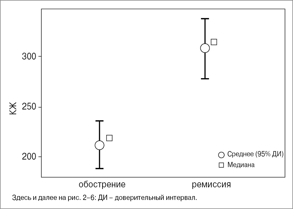 Рис. 1. КЖ у пациентов в стадии обострения и ремиссии.
