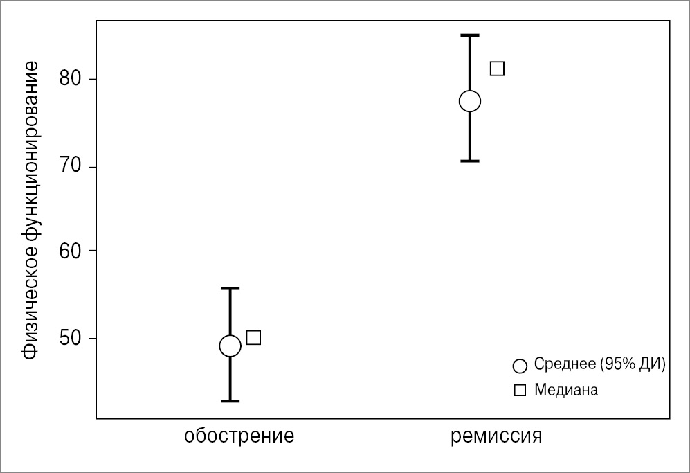 В большей степени снижались показатели физического функционирования, которые составили в стадии обострения 49,2±10,9, в ремиссии – 77,7±12,2 (p=0,004); рис. 2.