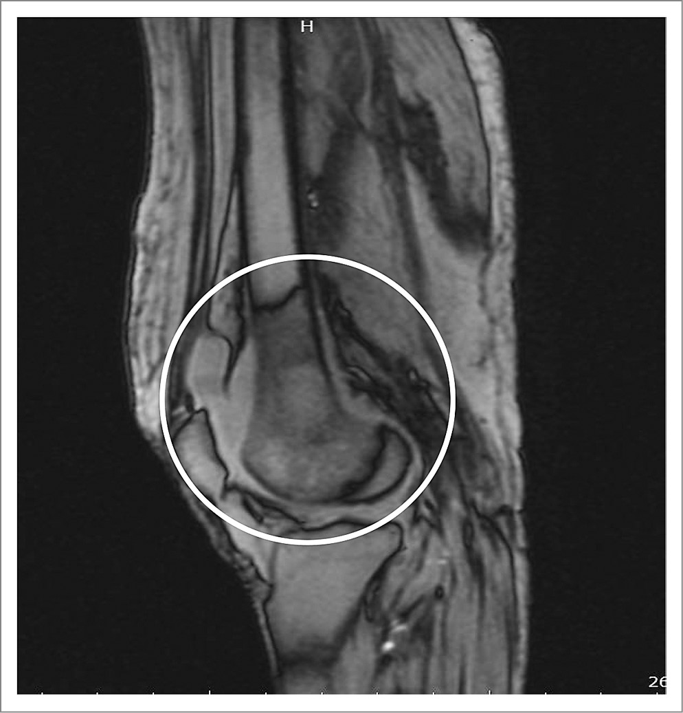 Рис. 1. МРТ правого коленного сустава. Признаки асептического некроза мыщелка правой бедренной кости с демаркационными линиями.