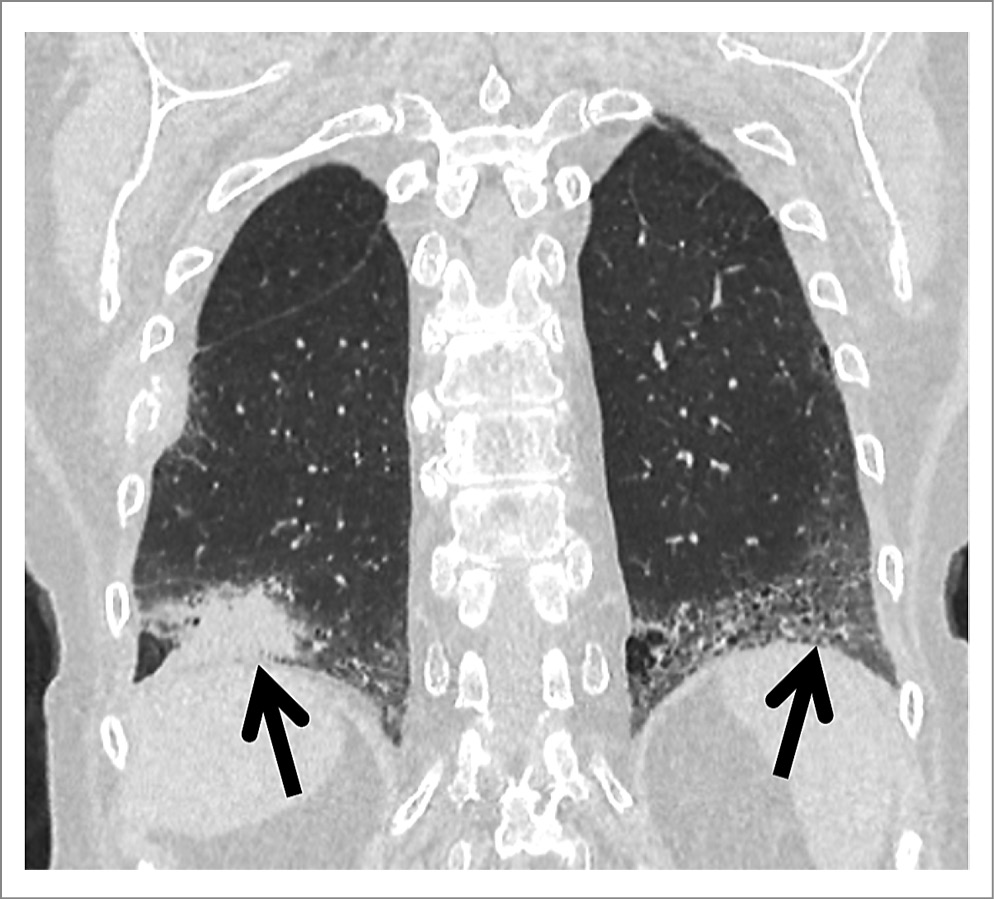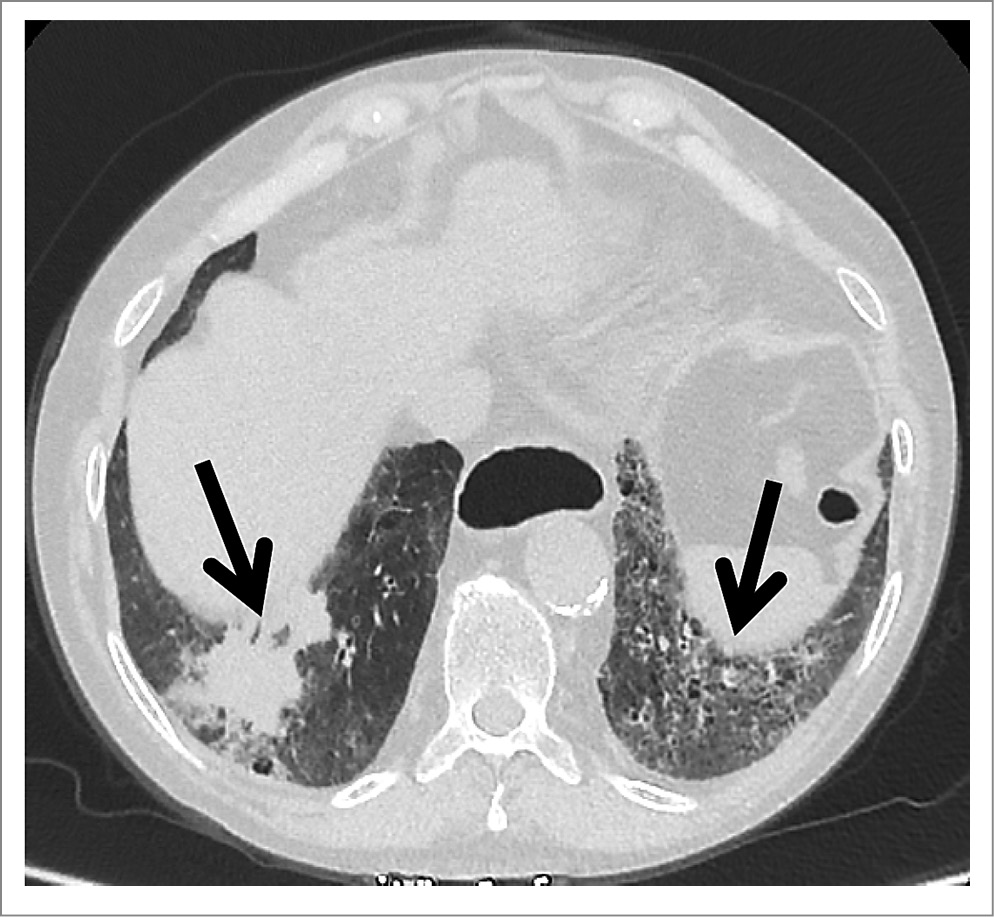 Рис. 2. КТ ОГК. Визуализируются образование нижней доли правого легкого, участки формирования сотового легкого в нижних отделах обоих легких, деструкция VII ребра справа.