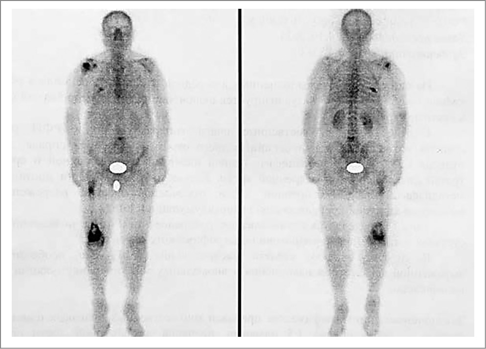 Рис. 4. Остеосцинтиграфия. Очаги патологического накопления радиофармпрепарата в диафизе правой бедренной кости, эпифизе правой плечевой кости, VII ребре справа и LV позвонке.