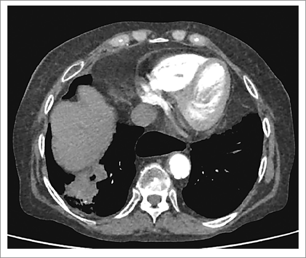 Рис. 5. МСКТ ОГК с внутривенным контрастированием. Неравномерное накопление контрастного препарата в образовании нижней доли правого легкого.