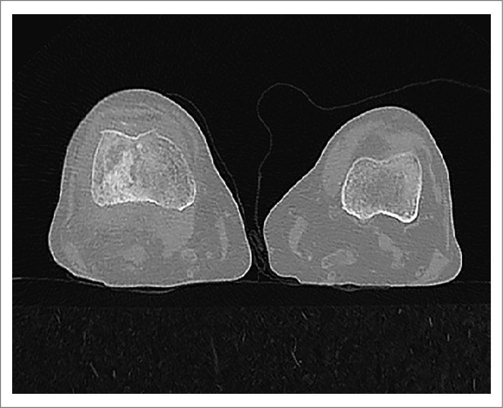 Рис. 6. МСКТ коленных суставов. Визуализируются выраженные изменения костной структуры с множественными участками разрежения и деструкции кортикального слоя.