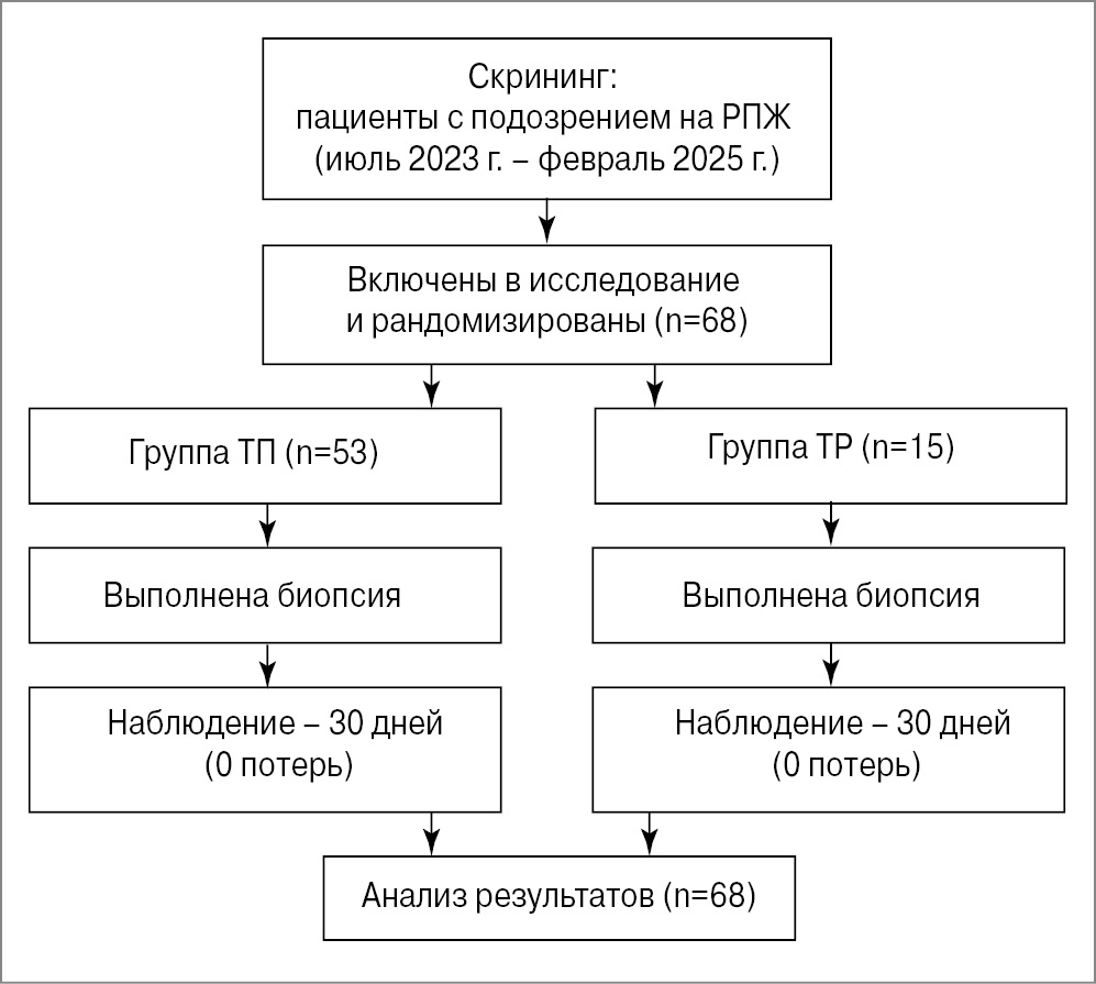 В исследование включены 68 пациентов, удовлетворяющих критериям, ни один не исключен после скрининга. Пациенты рандомизированы на 2 группы: 53 направлены на ТПБ, 15 – на ТРБ. Все 68 пациентов успешно прошли процедуру биопсии и наблюдение, выпадений из наблюдения не было. На рис. 1 представлена блок-схема дизайна исследования.
