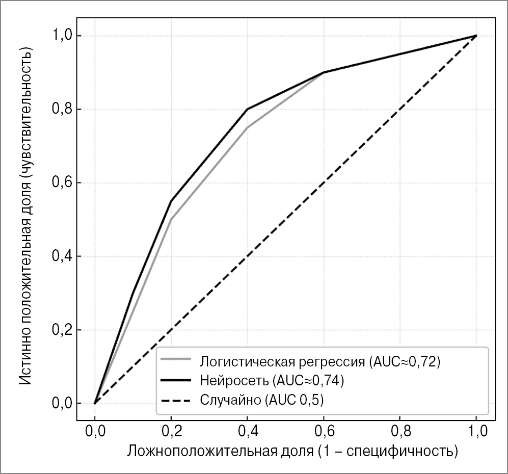 Рис. 2. ROC-кривые моделей прогнозирования инфекционных осложнений. Синим цветом показана ROC-кривая логистической регрессии (AUC 0,72), красным – нейронной сети (AUC 0,74). Пунктирная диагональная линия соответствует случайному угадыванию (AUC 0,5). Видно, что обе модели имеют близкую площадь под кривой, немного превышающую 0,7, что свидетельствует об их умеренной точности.