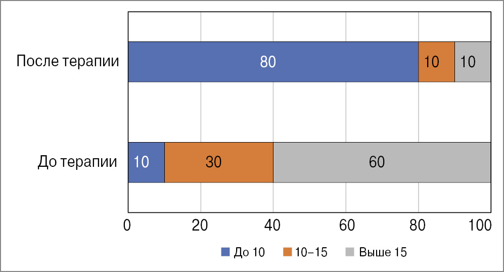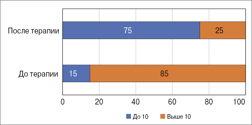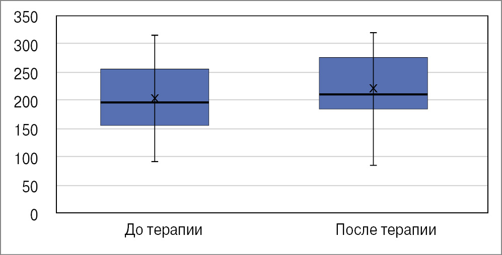Материалы исследования подвергнуты статистической обработке с использованием методов параметрического и непараметрического анализа. Количественные показатели оценивали на предмет соответствия нормальному распределению, для чего использовали критерий Шапиро–Уилка (при числе исследуемых лиц менее 50), а также показатели асимметрии и эксцесса. С целью сравнительного анализа динамики использовали t-критерий Стьюдента для зависимых выборок, на высоком уровне достоверности различия до и после терапии с уровнем значимости р≤0,001.
