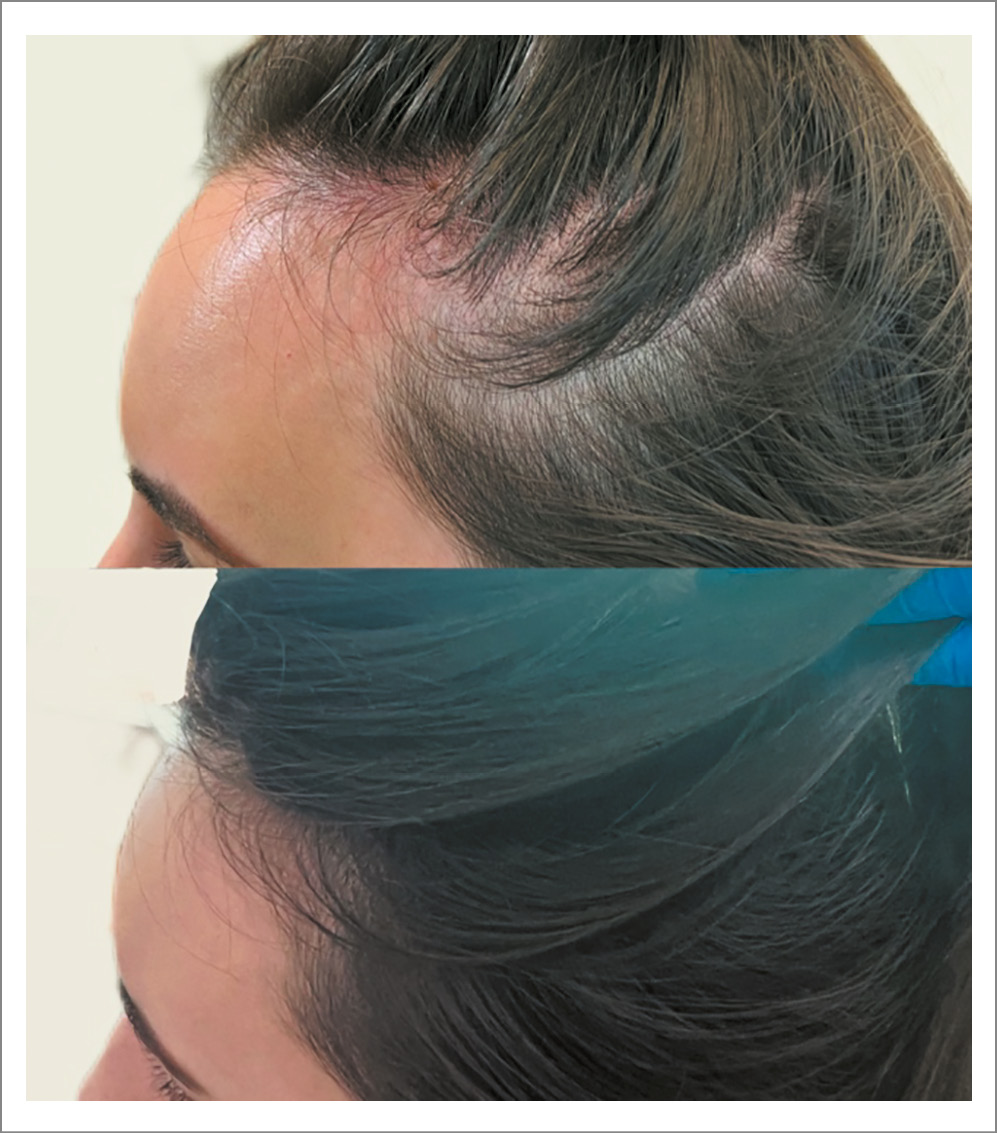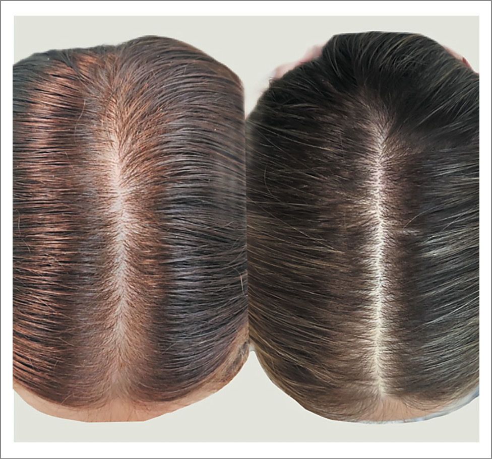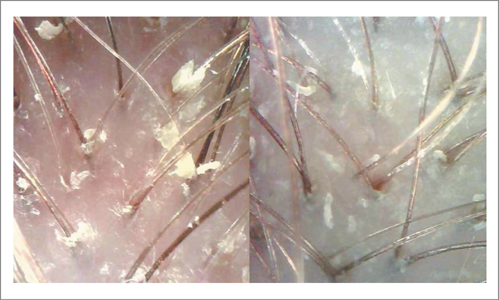 Рис. 7. Трихоскопическая картина до и после терапии пациентки 3-й группы.