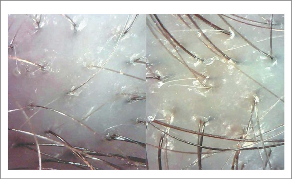 Рис. 6. Трихоскопическая картина до и после терапии пациентки 1-й группы.