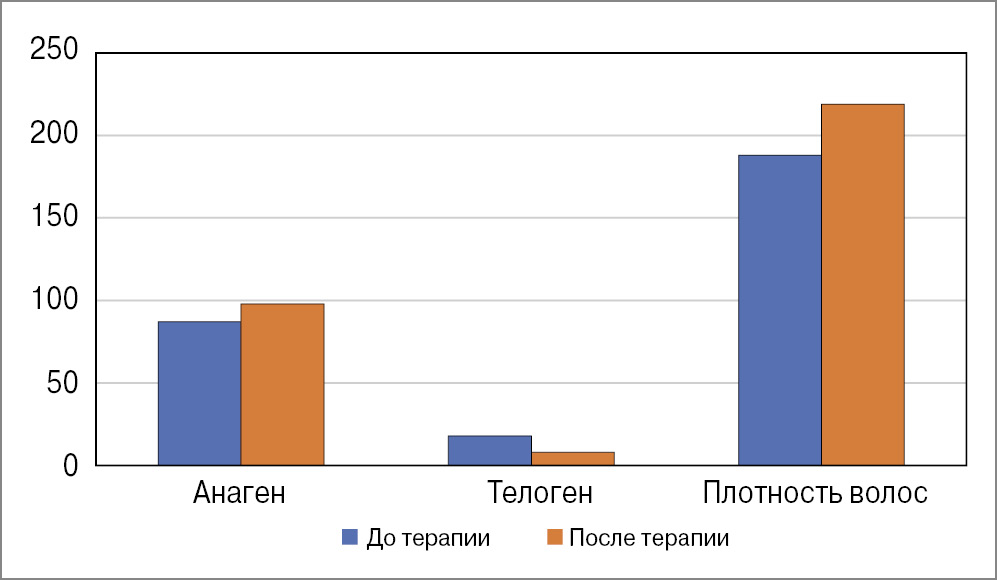 Results. The therapy exhibited significant clinical efficacy, evidenced by a decrease in hair loss, a reduction in the number of hairs in the telogen phase, and an increase in hair growth density per square centimeter as observed in the control phototrichogram. Additionally, the Pull-test yielded negative results. Patients reported enhanced volume and improved strength of their hair structure. The diagnostic procedure phototrichogram was performed twice during the study (at the start of therapy and after 3 months). Treatment was carried out for 3 months. In addition, patients were offered questionnaires on tolerability and assessment of the effectiveness of therapy.