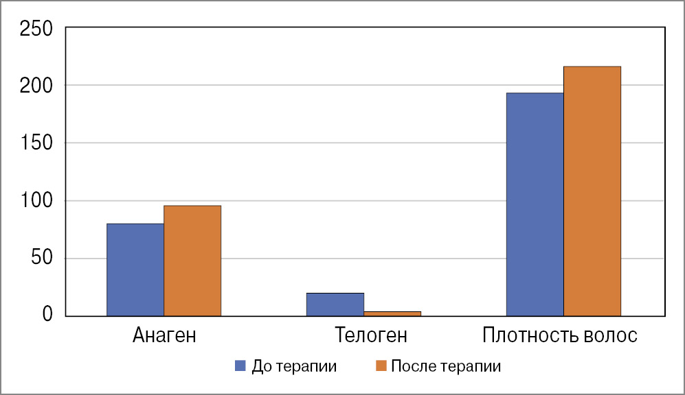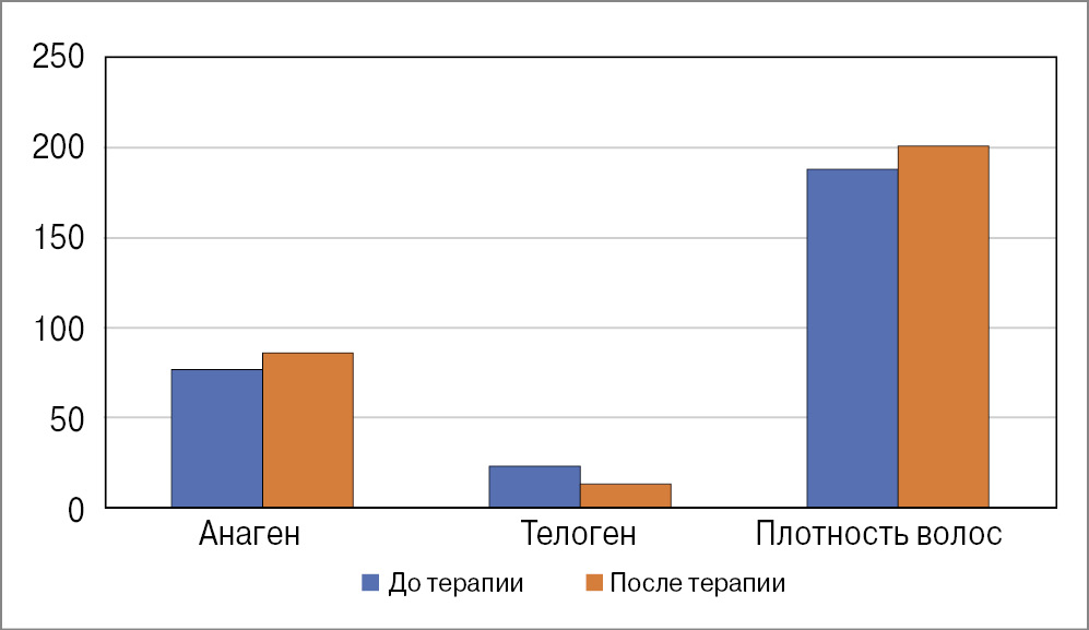 До начала лечения у всех пациенток отмечен положительный Pull-тест (более 3 волос в пучке 1 см2). После лечения Pull-тест был отрицательным у всех пациенток из 1 и 3-й групп, у 6 из 7 – во 2-й группе. Средние показатели параметров «анаген», «телоген», «веллус», «плотность» для групп на исходном уровне достоверно не различались.