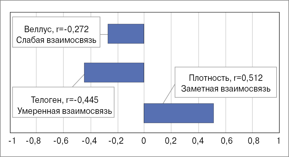 В результате оценки статистической значимости корреляционной связи между динамикой показателей «телоген», «веллус» и «плотность» и бинарным показателем «пероральный прием препарата» (Пантовигар) выявлена различная степень влияния последнего на трихоскопические показатели. Установлена заметная прямая корреляционная зависимость между параметрами «прием перорального препарата» и «плотность» (r=0,512; р<0,05). Результаты также продемонстрировали наличие умеренной обратной взаимосвязи между параметрами «прием перорального препарата» и «телоген» (r=-0,445; р<0,05). Между показателями «веллус» и «прием препарата» также обнаружена отрицательная слабая взаимосвязь (r=-0,272), однако корреляция не достигла критической значимости (рис. 11).