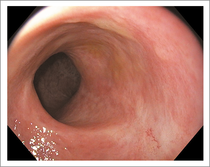 У пациента также исследован уровень онкомаркеров и серологических маркеров оппортунистической инфекции. Маркеры цитомегаловирусной инфекции и вируса Эпштейна-Барр (иммуноглобулины G и M) не повышены. Диаскин-тест – отрицательный. Концентрации онкомаркеров СА 19–9 и РЭА не повышены. Компьютерная томография органов грудной клетки – без патологии. Выполнена контрольная колоноскопия: индекс эндоскопической активности SES-CD составил 0 баллов (рис. 1). Вирусная ДНК цитомегаловирусной инфекции, вируса Эпштейна-Барр в исследуемом биопсийном материале слизистой оболочки кишки методом полимеразной цепной реакции не обнаружены. Индекс Харви-Брэдшоу составил 2 балла.