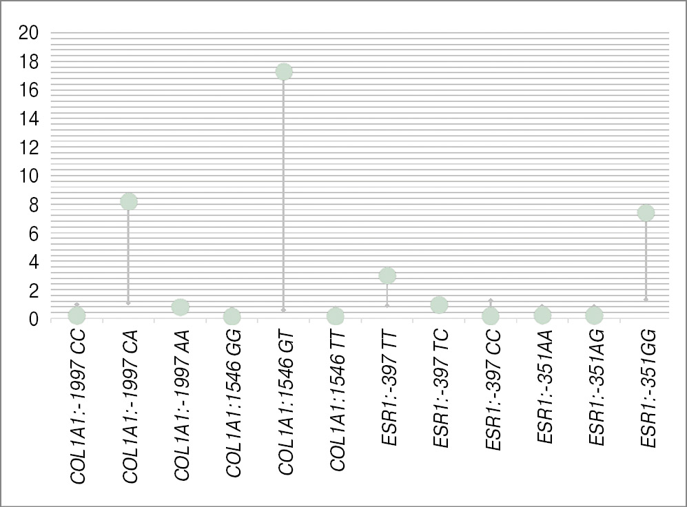 COL1A1:1546 GT+TT | 36 | 40,45 | 5 | 5,62 | 2,06 | 0,87 | 4,84 | ||