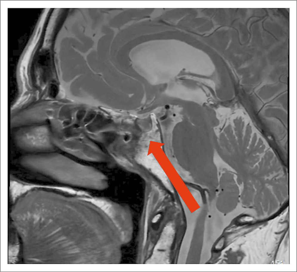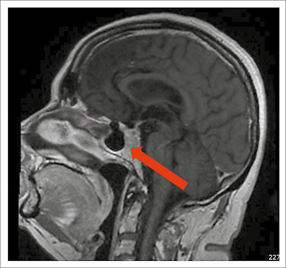 В январе 2025 г. (62 года) госпитализирована в клинику эндокринологии УКБ №2 ФГАОУ ВО «Первый МГМУ им. И.М. Сеченова» (Сеченовский Университет) с жалобами на выраженную мышечную слабость, прогрессирующее снижение мышечной массы в руках и ногах, снижение работоспособности, сниженный фон настроения, боли в грудном и поясничном отделах позвоночника. При объективном осмотре обращали на себя внимание перераспределение подкожно-жировой клетчатки по центрипетальному типу (индекс массы тела – 34,8 кг/м2), гиперемия щек, снижение мышечной силы в конечностях. По результатам лабораторного обследования подтверждена персистенция БИК: уровень свободного кортизола в суточной моче – 67,5 мкг/сут (1,5–63), кортизол в ночном подавляющем тесте с 1 мг дексаметазона – 179 нмоль/л (< 50). Уровень АКТГ снизился до 7,8 пмоль/л (< 10 пмоль/л). При проведении большой дексаметазоновой пробы получено снижение кортизола на 80% от исходного уровня (кортизол в 8:00 исходно – 662 нмоль/л, кортизол в 8:00 после приема 8 мг дексаметазона – 132 нмоль/л). По данным МРТ головного мозга – послеоперационные изменения передне-нижних отделов гипофиза, селлярной области и основной пазухи (рис. 3).