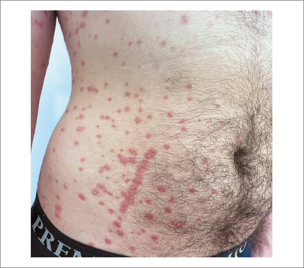Юноша 18 лет, заболел остро, в течение 2 мес после перенесенного COVID-19 появились распространенные диссеминированные высыпания на коже волосистой части головы, лица, верхних и нижних конечностей (рис. 1). Обратился к дерматологу по месту жительства, выставлен диагноз «псориаз». Осмотр при поступлении: патологический процесс на коже носит хронический распространенный характер, локализуется на коже лица, ушных раковин, волосистой части головы, туловища, верхних и нижних конечностей, ягодиц. Пациент не отягощен соматически. При поступлении по результатам обследования лабораторные показатели общего анализа крови и мочи – в пределах референсных значений, по результатам биохимического анализа крови незначительно повышен общий билирубин (32,2 мкмоль/л), по результатам ультразвукового исследования органов брюшной полости впервые выявлены эхографические признаки незначительной гепатомегалии, умеренные диффузные изменения поджелудочной железы. Консультирован терапевтом – противопоказаний для проведения цитостатической терапии не имеет, рекомендован лабораторный контроль в динамике.