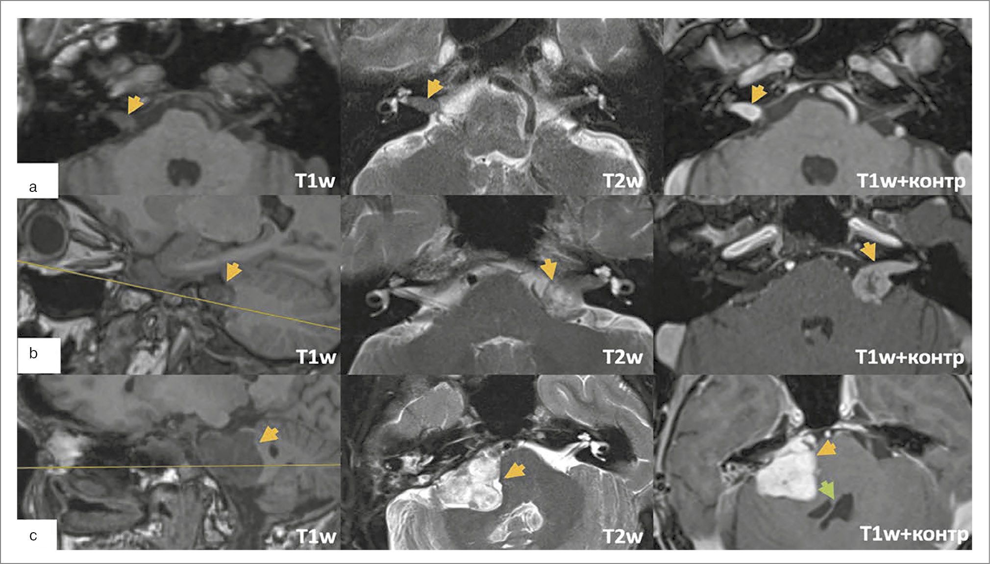 Рис. 1. МРТ-исследования пациентов с ВШ: а – интраканальная опухоль левого ВСП; b – новообразование левого ВСП Т2 по классификации Koos; опухоль заполняет всю мостомозжечковую цистерну, доходит до ствола; c – новообразование правого ВСП Т4 по Koos; опухоль оттесняет структуры ствола, сдавливает ликвороотводящую систему (зеленая стрелка). Здесь и далее на рис. 2–4 желтой стрелкой указан патологический процесс.