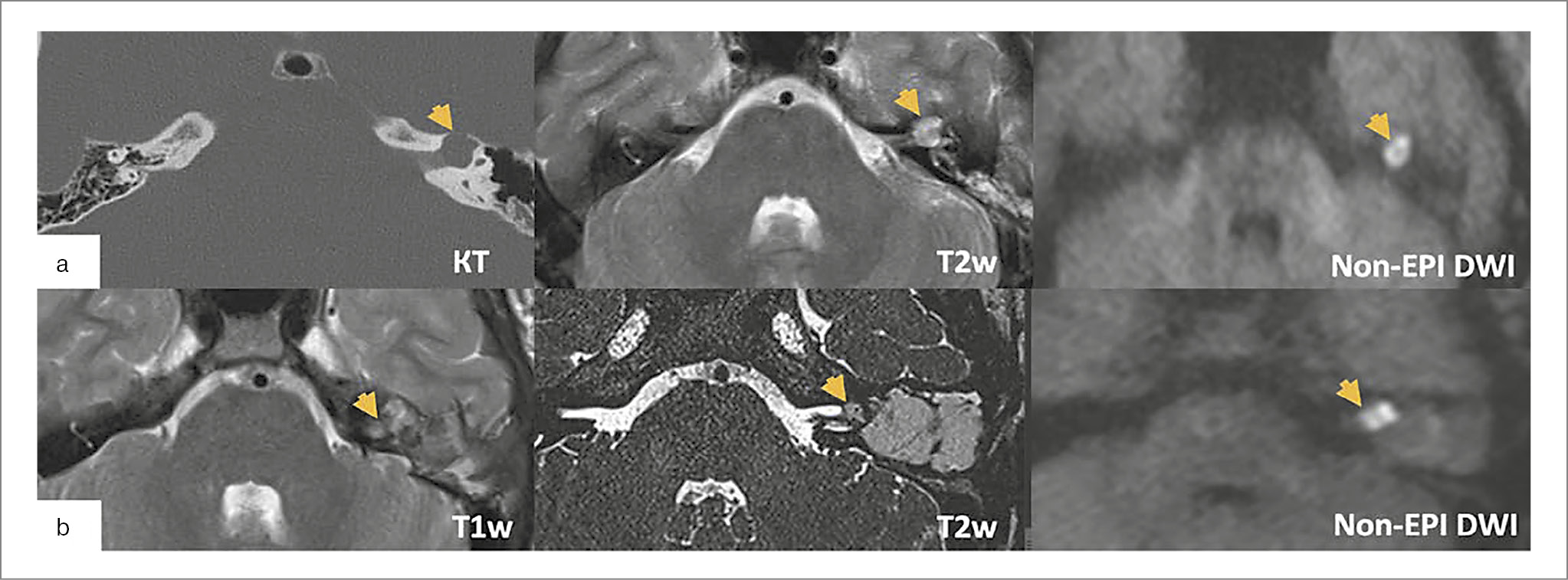 Исследования МРТ производятся в стандартных режимах (Т1 – гипоинтенсивный сигнал, Т2 – гиперинтенсивный), они дополняют КТ в ходе дифференциальной диагностики. Большое значение имеет non-EPI (В1000) DWI – последовательность, высокоспецифичная для холестеатомы, играет большую роль в определении рецидивов, особенно при закрытых техниках (облитерация послеоперационной полости и закрытие наружного слухового прохода cul-de-sac); рис. 2. В случае протяженного контакта холестеатомы с магистральными сосудами и возможной необходимости перекрытия просвета сигмовидного синуса необходимо проведение МРТ с внутривенным контрастированием либо в режимах MPА (ToF, PC, 4D), чтобы оценить достаточность венозного оттока по контрлатеральной стороне [21].