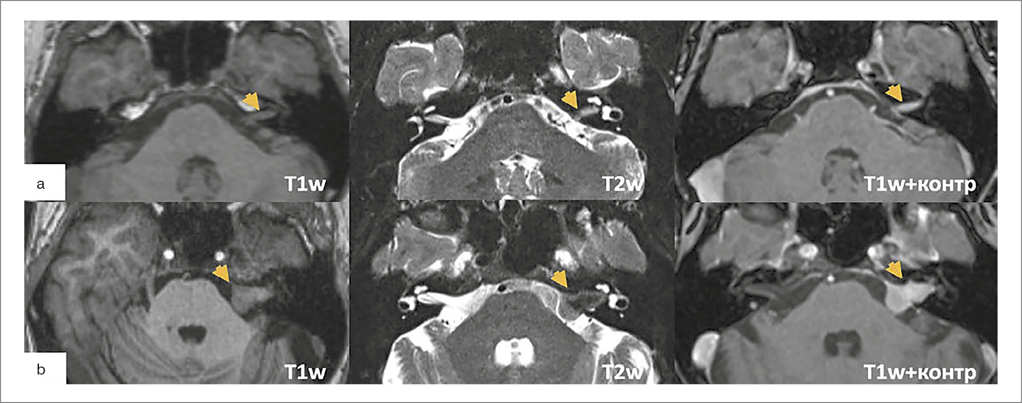 МРТ (не менее 1,5 Т) – метод выбора для выявления ВШ, при этом Т1-взвешенные изображения (тонкосрезовые спин-эхо или турбо-спин-эхо) с контрастным усилением считаются «золотым стандартом» как при установке диагноза, так и в периоде наблюдения [17, 18]. Протокол МРТ должен включать стандартные Т1- и Т2-взвешенные последовательности, диффузионно-взвешенные изображения (DWI) и режимы с жироподавлением. Режим non-EPI DWI полезен для дифференциации ВШ от арахноидальных или эпидермоидных кист. По крайней мере одна Т2-взвешенная последовательность обязательна, чтобы исключить возможную патологию ствола мозга, имитирующую симптомы ВШ (глиомы, рассеянный склероз) [18]. Аксиальная субмиллиметровая высокоинтенсивная Т2-взвешенная последовательность наиболее важна для оценки нервов ВСП [визуализируются как линейные гипоинтенсивные структуры, окруженные гиперинтенсивной спинномозговой жидкостью в цистернах (FIESTA, CISS или DRIVE)].