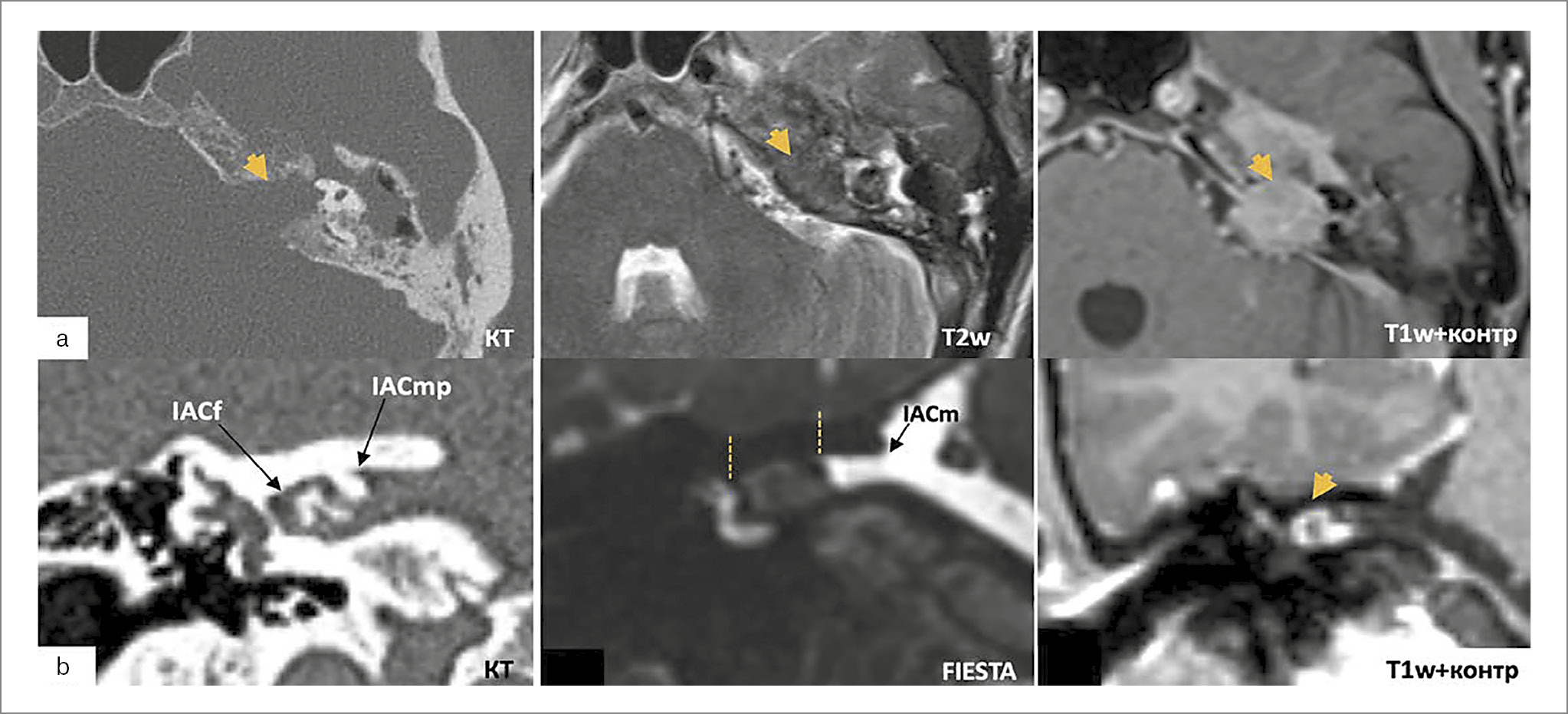 Рис. 4. Исследования пациентов с параганглиомой и остеомой ВСП: а – параганглиома с распространением в ВСП; b – интраканальная остеома ВСП. IACf – дно внутреннего слухового прохода; IACmp – средняя часть внутреннего слухового прохода; IACm – внутреннее отверстие внутреннего слухового прохода.