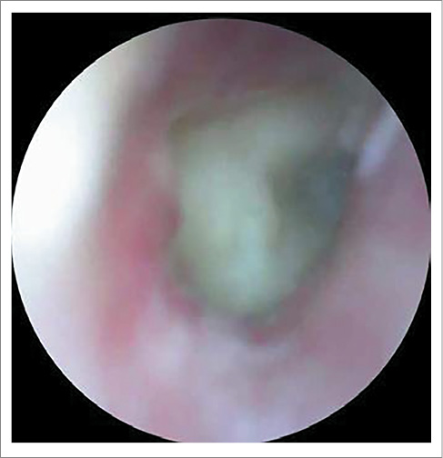 Рис. 1. Отоскопическая картина справа при поступлении: тотальная перфорация БП, слизистая медиальной стенки барабанной полости утолщена, покрыта серо-белым субстратом (фибрин? некротические ткани?).