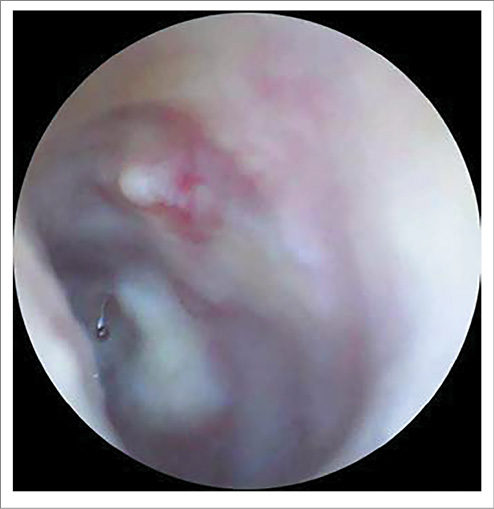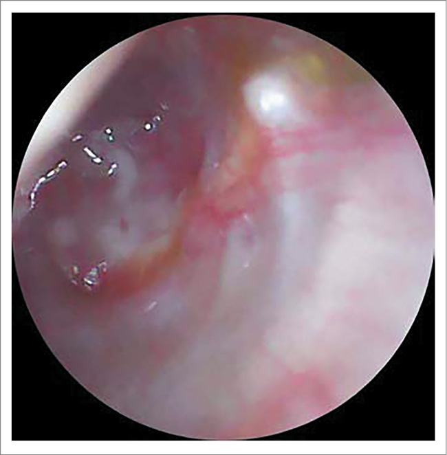 Рис. 8. Отоскопическая картина справа перед выпиской: васкуляризация слизистой оболочки медиальной стенки барабанной полости, уменьшение зоны некротических изменений.