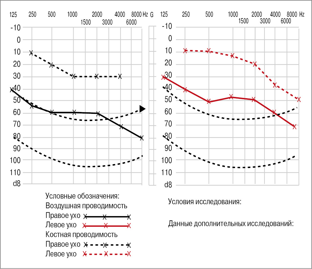 По данным тональной пороговой аудиометрии определялась двусторонняя кондуктивная тугоухость с нейросенсорным компонентом (рис. 3).
