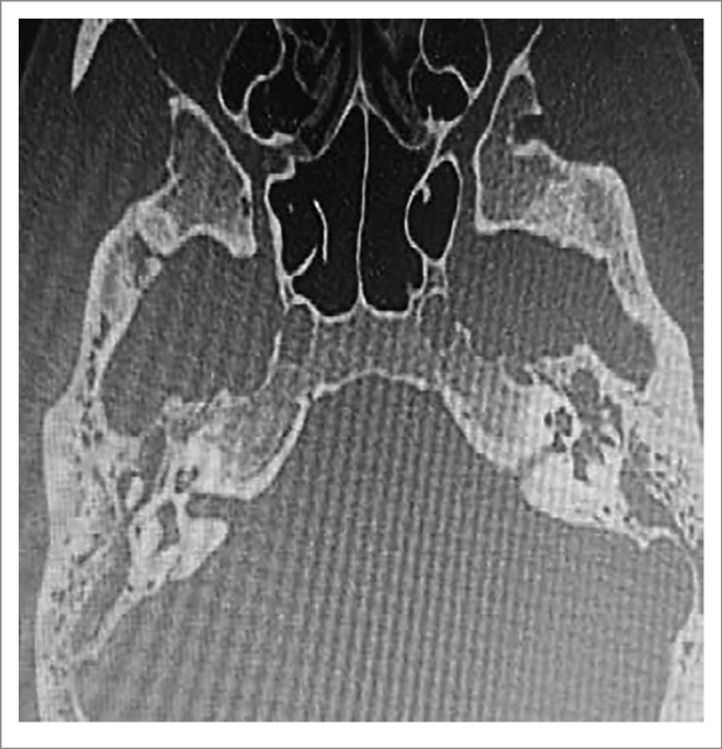 Рис. 4. КТ, аксиальный срез: тотальное затемнение полостей среднего уха без деструктивных изменений, цепь слуховых косточек сохранна, прослеживается на всем протяжении.