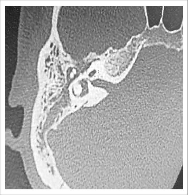 Рис. 5. КТ, аксиальный срез, правая височная кость: тотальное затемнение полостей среднего уха без деструктивных изменений, цепь слуховых косточек сохранна, прослеживается на всем протяжении.