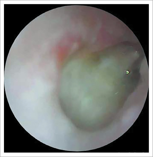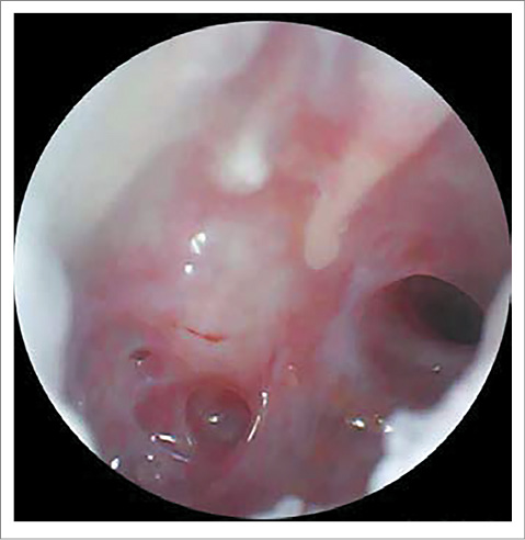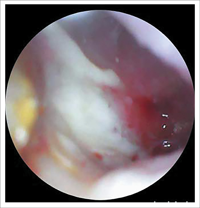 Рис. 6. Отоскопическая картина справа после курса консервативной терапии: тотальная перфорация БП, слизистая медиальной стенки барабанной полости утолщена, покрыта серо-белым субстратом (фибрин? некротические ткани?).