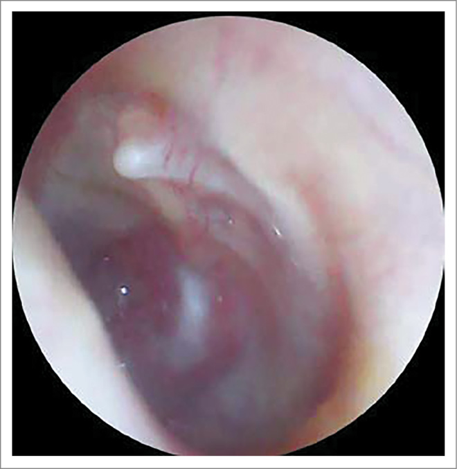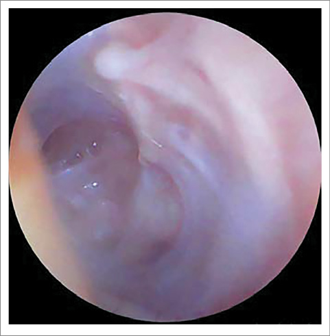 Рис. 2. Отоскопическая картина слева при поступлении: БП утолщена, местами гиперемирована, в передних отделах визуализируется центральная перфорация диаметром 2 мм.