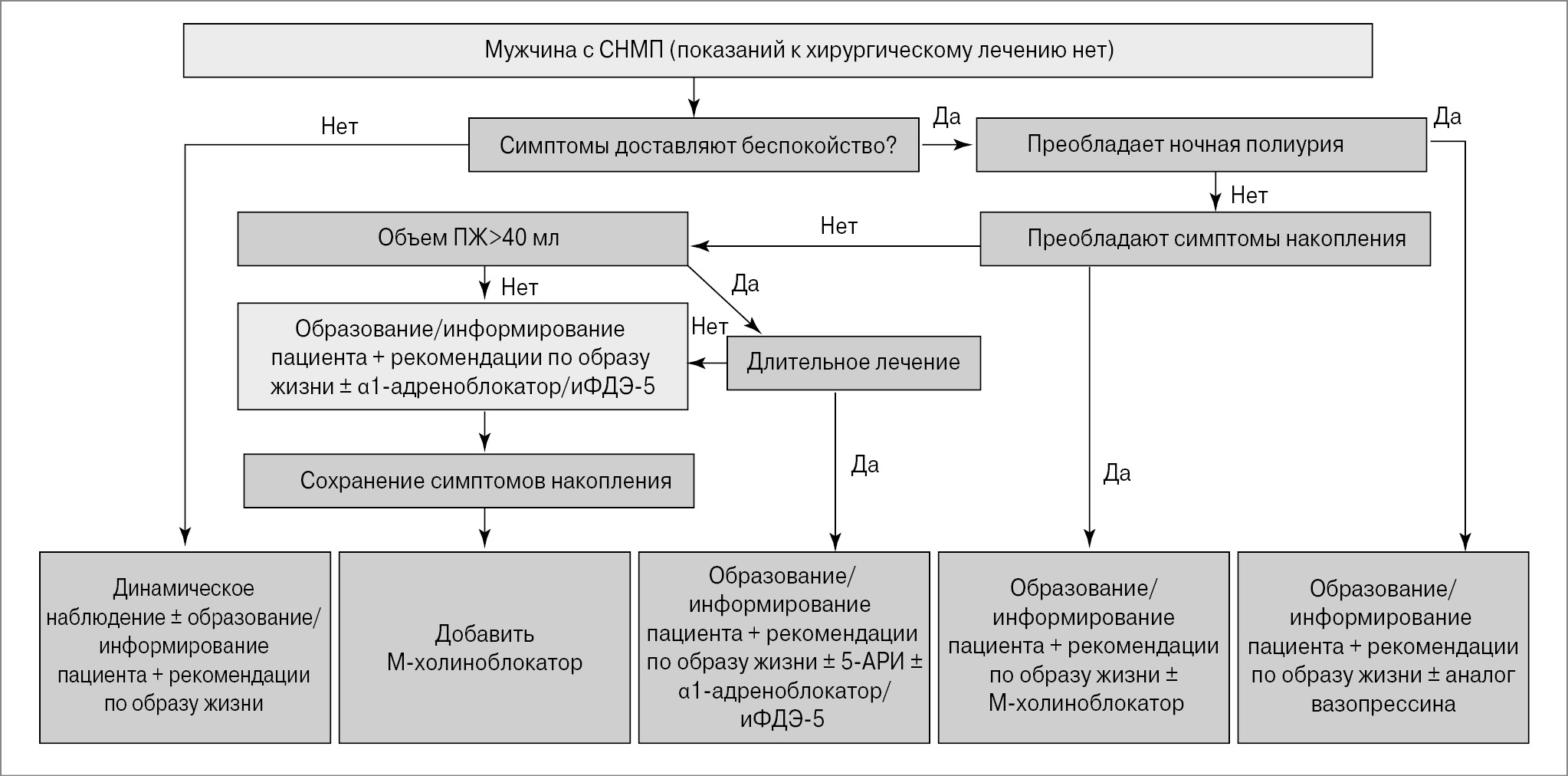 В современной урологии ежедневно разрабатываются индивидуальные планы лечения для пациентов, которые основываются на тяжести СНМП, оценке субъективного состояния пациента (качества его жизни), размере ПЖ, а также наличии сопутствующих заболеваний. У многих больных симптомы не настолько выражены, чтобы вызывать беспокойство по поводу лечения. Вследствие этого перед началом любого терапевтического или хирургического вмешательства важно провести полное обследование, обсудить с пациентом детали лечения и выбранную тактику.