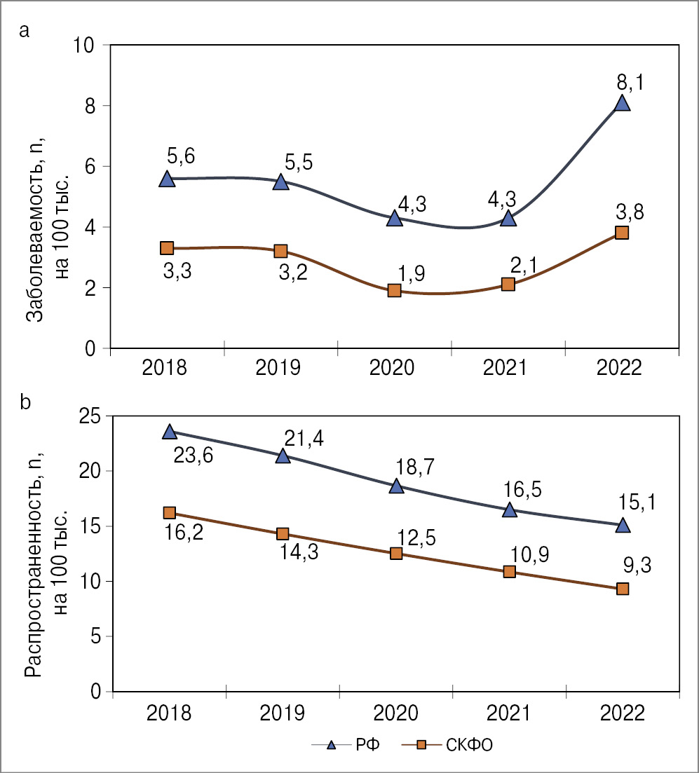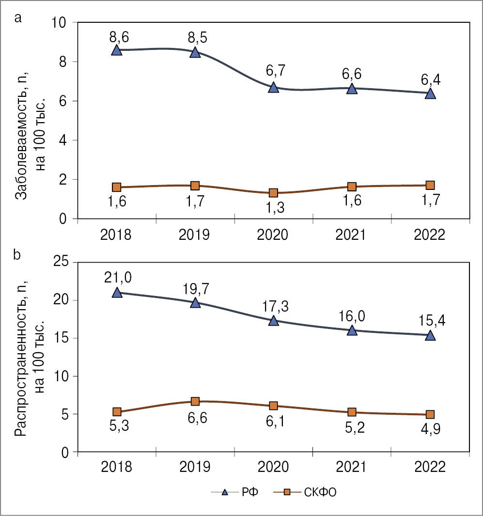 Отмечено снижение заболеваемости и распространенности сочетанной инфекции ТБ/ВИЧ в РФ (рис. 3) за 2018–2022 гг. (прирост -25,6 и -26,7%), в СКФО уровень заболеваемости за данный период практически не изменился, а прирост распространенности составил лишь -7,5%.