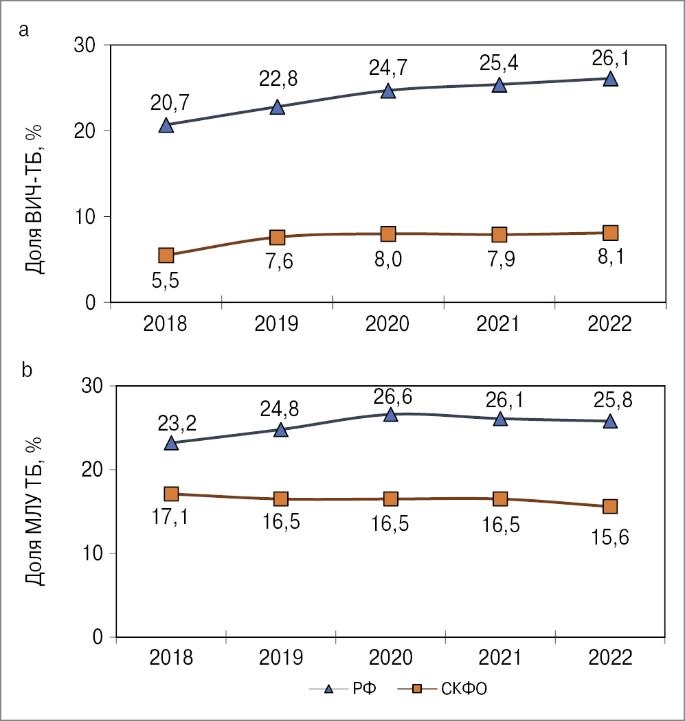 Conclusion. HIV infection and the spread of multidrug-resistant tuberculosis lead to the development of infectious foci with new characteristics. The incidence of multidrug-resistant tuberculosis is increasing in Russia and the North Caucasus Federal District; a sharp jump occurred in 2022 compared to 2021. The proportion of patients with a combination of tuberculosis and HIV infection among all patients with tuberculosis is constantly growing.