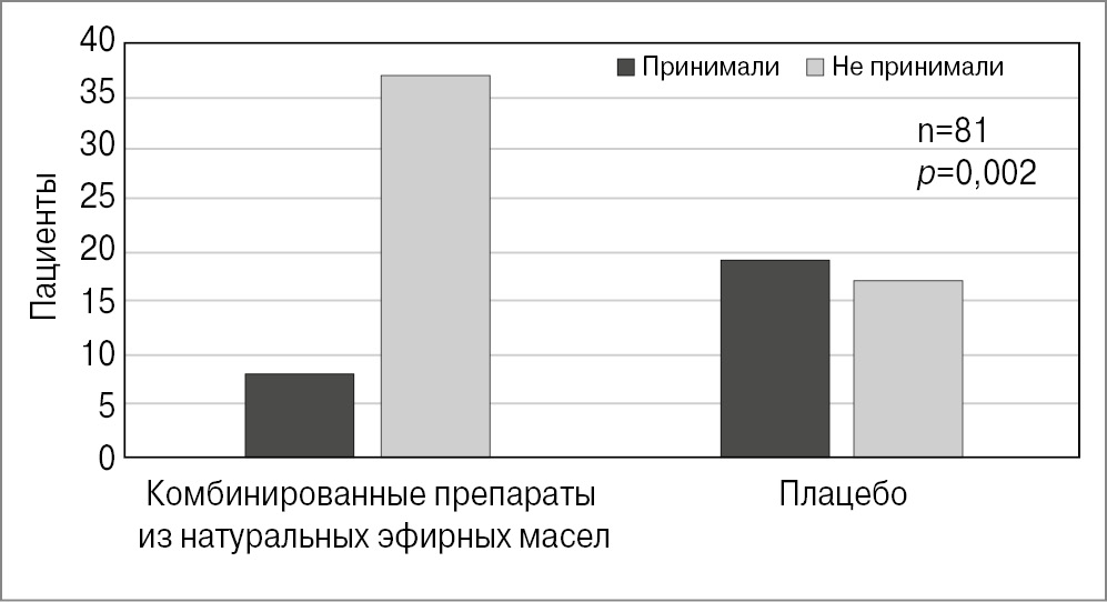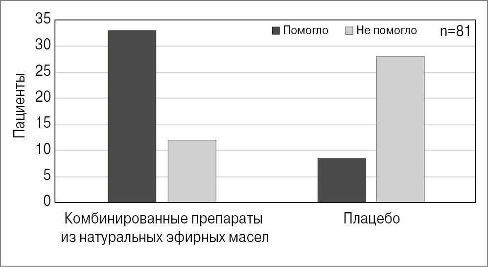 Один из вопросов касался того, оказал ли масляный спрей полезное воздействие на пациентов. Из них 33 (73,3%) пациента из группы комбинированных препаратов из натуральных эфирных масел (CDNEO) сообщили, что препарат им помог, в то время как 12 (26,7%) не отметили какой-либо пользы от CDNEO. В группе плацебо 8 (22,2%) пациентов отметили, что препарат им помог, а 28 (77,8%) сказали, что не помог. Отмечены статистически значимые различия между типом препарата и его воспринимаемой эффективностью (p<0,001); рис. 1.