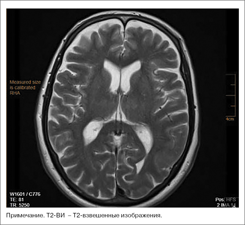 Рис. 1. Пациентка С., 72 года. МРТ-исследование ГМ 20.02.2020: аксиальные Т2-ВИ, МР-сигнал от правого и левого таламуса не изменены, достоверные признаки наличия очагов не визуализируются.