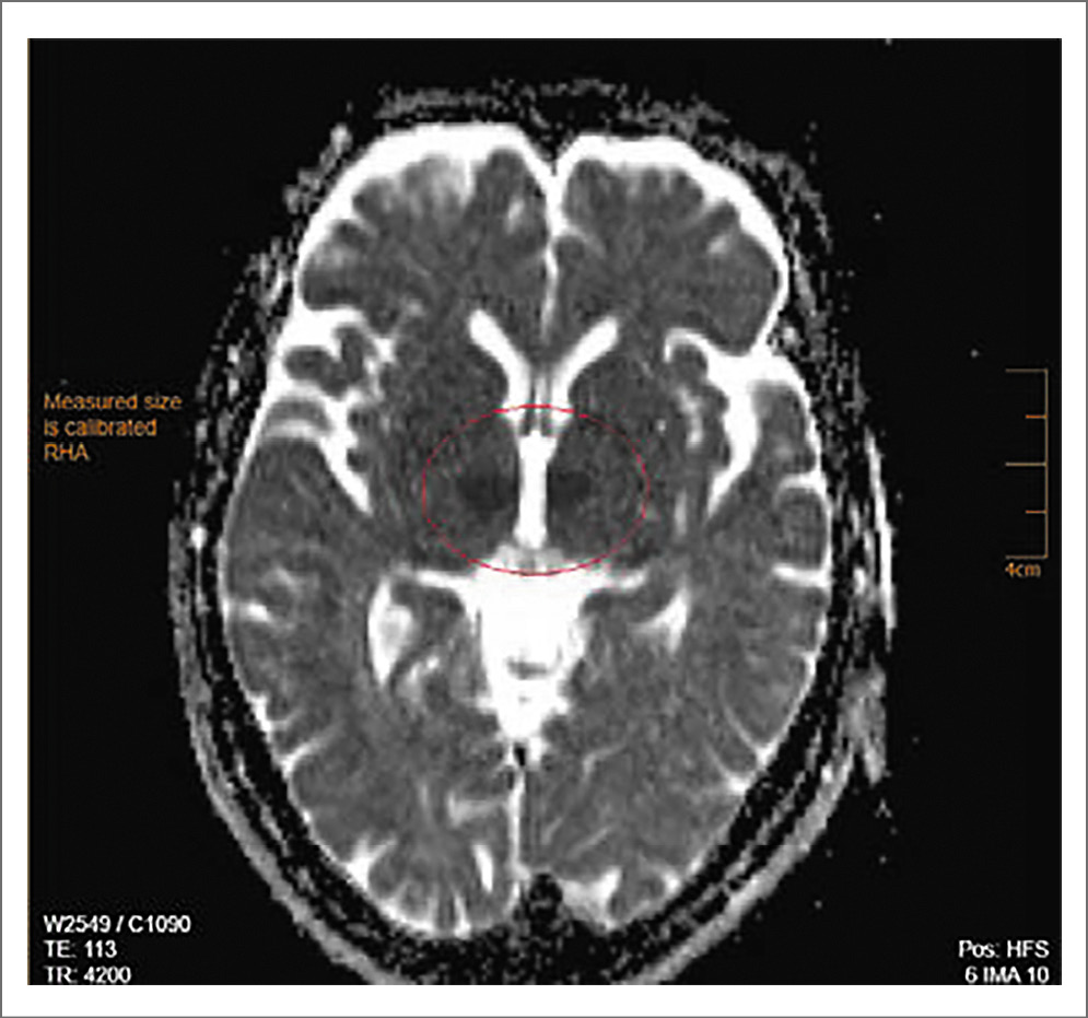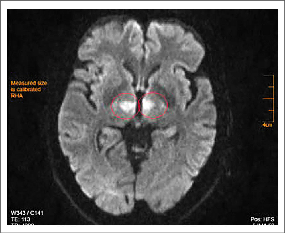 Рис. 2. Пациентка С., 72 года. МРТ-исследование ГМ 20.02.2020: аксиальные диффузионные ВИ (DWI), фазовая кодировка A>P, коэффициент b-фактора 1000, в области правого и левого таламуса определяются очаги симметричного расположения с умеренным гиперинтенсивным МР-сигналом.